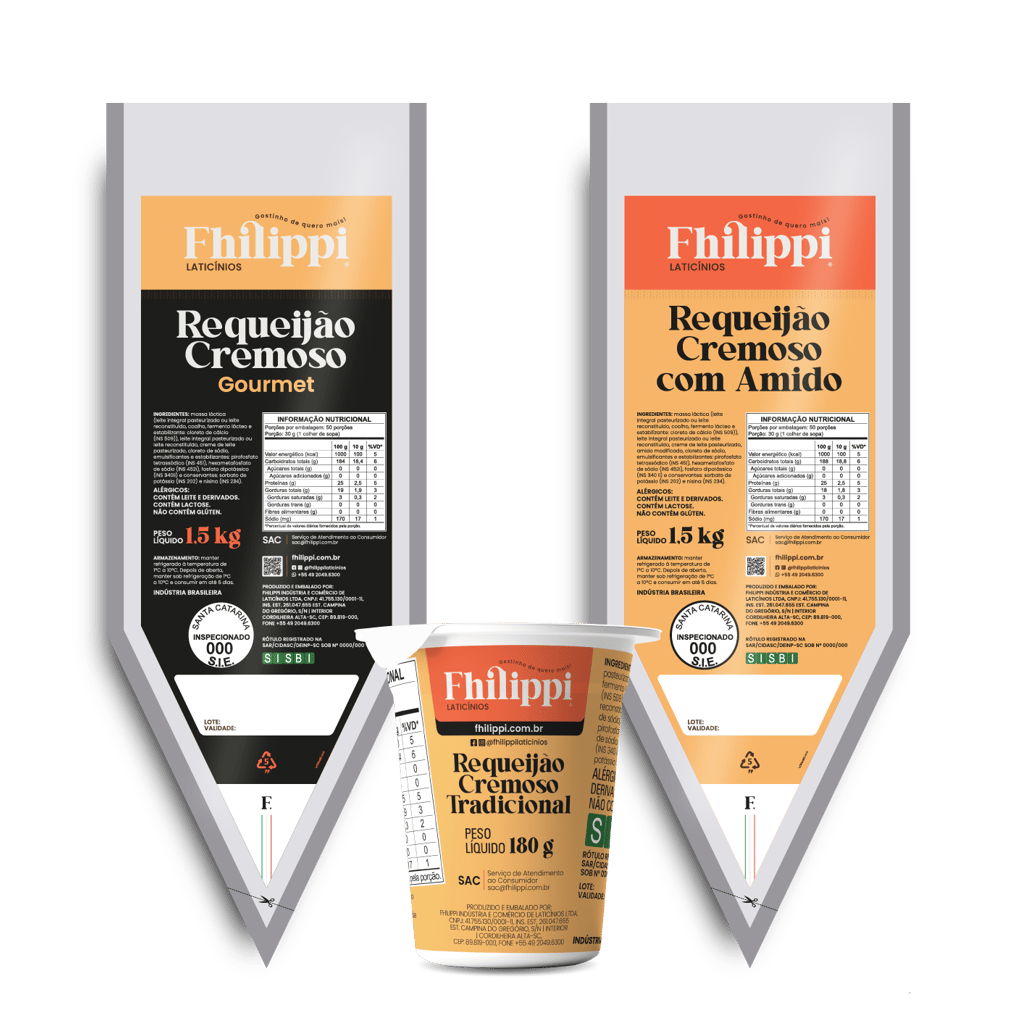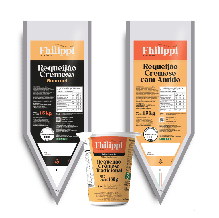 Na Fhilippi Laticínios você encontra requeijão cremoso com amido bisnaga de 1,5kg, gourmet bisnaga de 1,5kg e o tradicional de 180g.